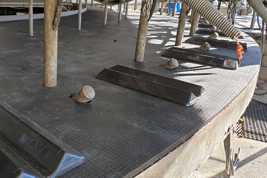 Interlocking platform mats that provide full coverage of the rotary platform. Relaxes cows while milking, reducing the risk of cows slipping off the platform and speeding up milking times.